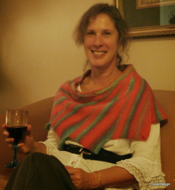 It was so easy, a Tunisian simple stitch done in wedges by decreasing and increasing at the ends.  The size shown fits an average woman, I am larger than average, and my gauge was a little off to the smaller side, not having a larger Tunisian hook to go up to,  for me I would have made two more wedges, if I had the yarn, and it would have been perfect.  I took pictures of it on my neighbor and it looks great.  She especially liked the neckline not right up her neck.