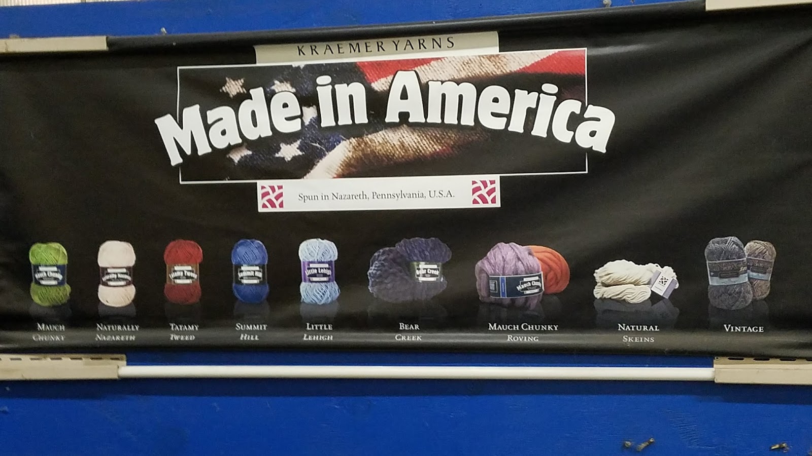 A big poster shows Kraemer Yarns products and that they are very proud to be Made in America.